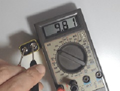 Após selecionar a escala correta no aparelho girando a chave seletora, conecte as pontas de prova aos pólos da bateria, com firmeza, e verifique no visor do multímetro o valor medido.