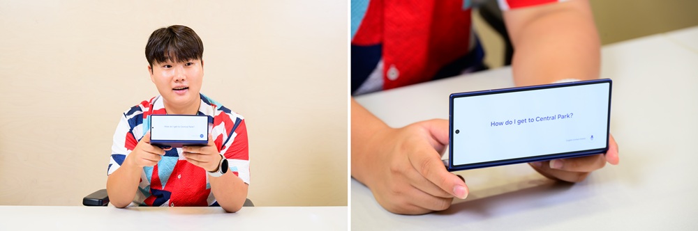(Da esquerda para a direita) Os Samsung Supporters, Hajung Kim e Wansu Kim, usam os novos recursos de acessibilidade aplicados à One UI 8