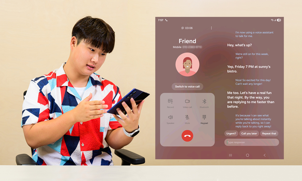 Agora, com a One UI 8, as Chamadas de texto em tempo real exibem o texto no momento em que a outra pessoa começa a falar, permitindo que os usuários acompanhem a conversa e preparem suas respostas sem atraso. “Mesmo em ligações pessoais, poder ver em tempo real o que a outra pessoa está dizendo me faz sentir muito mais próximo dela”, contou Wansu Kim.