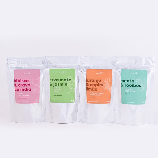Na Evah, a combinação ainda conta com camomila, maçã, gengibre e menta. Os chás são 100% naturais, livres de conservantes e sem substancias tóxicas ao organismo.