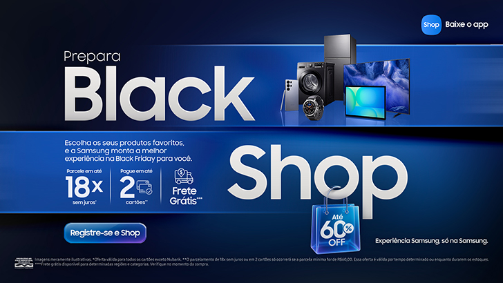 A Samsung apresenta a Prepara Black Shop, ação da Black Friday 2025 que oferece uma jornada de compra feita sob medida para cada consumidor, com ofertas de até 60% de desconto e vantagens exclusivas no app Samsung Shop e na Loja Online Samsung, incluindo parcelamento em até 18x sem juros1 e frete grátis2.