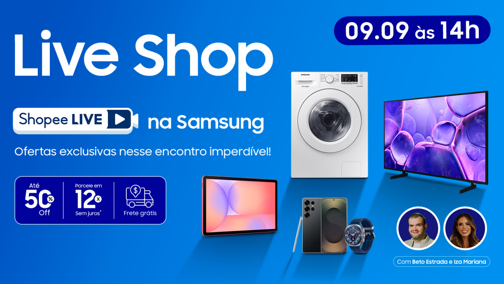 A Samsung realiza, nesta terça-feira (9), sua primeira Live Shop em parceria com a Shopee, com ofertas especiais em TVs, smartphones, smartwatches, fones de ouvido sem fio, notebooks e tablets do portfólio da marca.