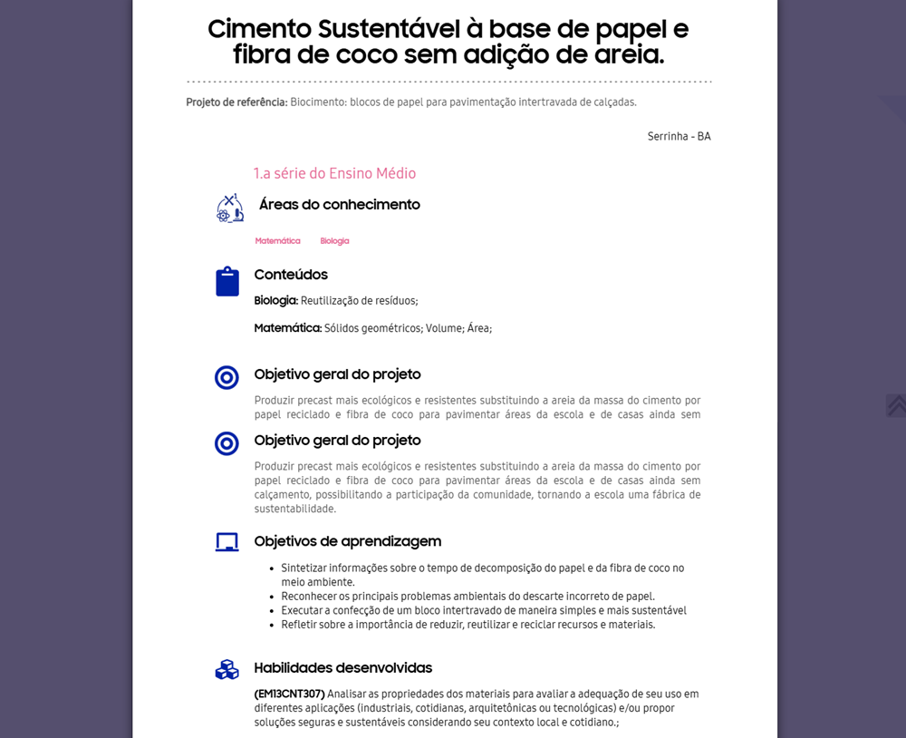 Com informações sobre a criação de projetos que vão desde os métodos de desenvolvimento até os processos de orientação aos estudantes, o Banco de Práticas pode ser acessado considerando a disciplina2 de cada projeto, bem como os conteúdos abordados por cada um deles e as habilidades desenvolvidas ao longo do programa. É possível selecionar o projeto de interesse a partir do ano em que participou do programa e do Estado brasileiro em que foi desenvolvido.