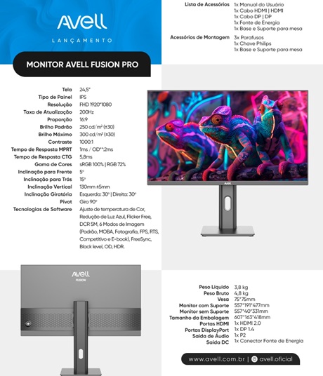 Os monitores Fusion Pro oferecem uma opção equilibrada e com alto custo-benefício. Com tela de 24,5” e painel IPS, o periférico entrega resolução FHD 19201080 e taxa de atualização de 200Hz, proporcionando movimentos mais fluidos e nítidos, com menos desfoque e maior responsividade, sendo indicado especialmente em jogos de ritmo acelerado e conteúdo de alta velocidade. Além disso, o monitor oferece cores vívidas com brilho máximo de 300cd/m2 e contraste 1000:1.