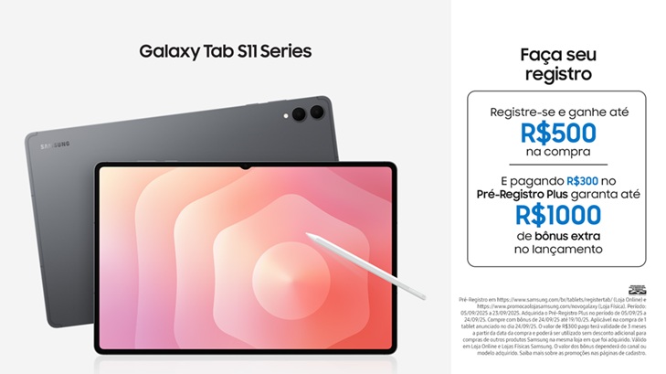 2 Pré-Registro em https://www.samsung.com/br/tablets/registertab. Receba até R$ 500 para compra de Galaxy Tab S11 Ultra, até R$ 375 para compra de Galaxy Tab S11 5G e até R$ 350 para compra de Galaxy Tab S11 Wi-Fi. Período de cadastro: 05/09/2025 até 23/09/2025. Período de compras: 24/09/2025 até 19/10/2025. Consulte regulamento: https://samsung.com.br/regulamentos/pre-registro-tab-s11.pdf.