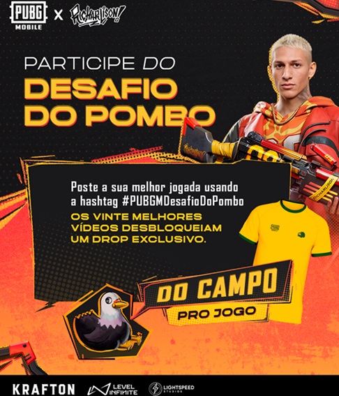 Completando as ações relacionadas à colaboração com Richarlison, PUBG MOBILE lança também o Desafio do Pombo, do qual os fãs poderão participar e ter a chance de ganhar prêmios exclusivos da colaboração com Richarlison.