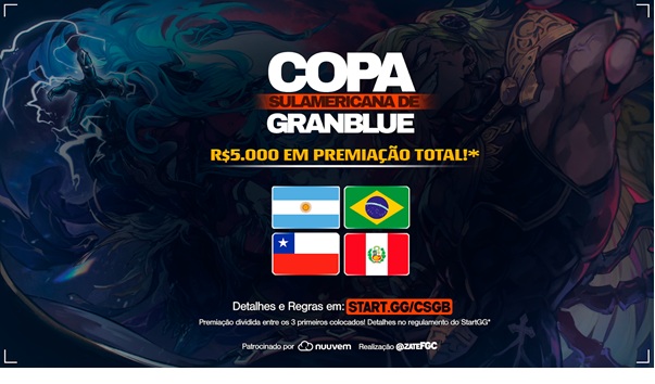 As inscrições já estão abertas para a Copa Sulamericana de Granblue! Prepare seus melhores combos para encarar adversários do Brasil, Argentina, Chile e Peru que disputarão o prêmio total de R$ 5.000. Para quem vai ficar na torcida, todas as partidas serão transmitidas ao vivo via Twitch e Discord. O Campeonato realizado pela ZateFGC é patrocinado pela Nuuvem.