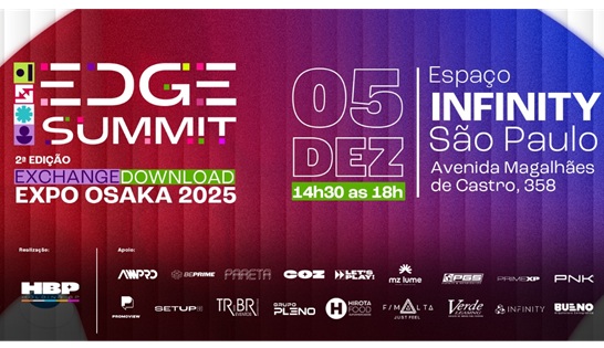 A HoldingBP anuncia a 2ª edição do Edge Summit, que será realizada em 5 de dezembro de 2025, das 14h30 às 18h, no Espaço Infinity (Avenida Magalhães de Castro, 358 – SP). O encontro, gratuito e aberto ao público, reunirá líderes e profissionais dos setores de eventos, live marketing, inovação, turismo e experiências para apresentar um compilado exclusivo dos principais conteúdos da Expo Osaka 2025, uma das mais relevantes feiras globais dedicadas ao futuro, tecnologia e transformação das cidades.