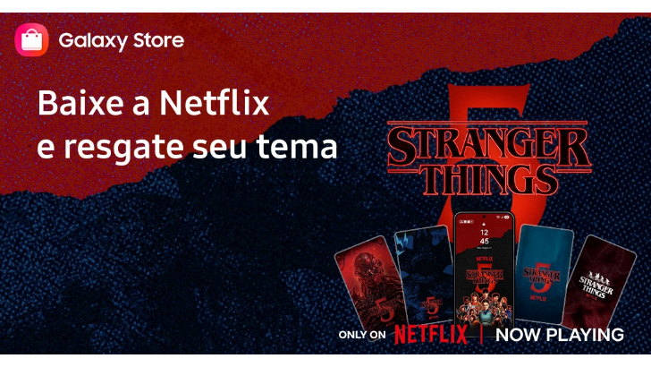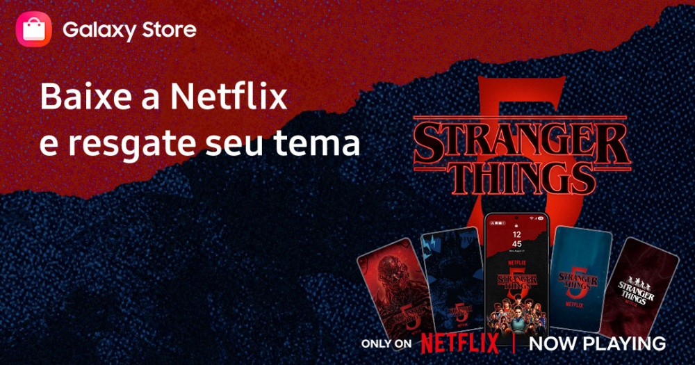A parceria entre a Samsung e a Netflix segue trazendo a atmosfera de Stranger Things para o dia a dia dos fãs. Até este domingo, dia 22 de fevereiro1, usuários de smartphones Samsung Galaxy podem baixar gratuitamente a coleção especial de temas2 inspirados na quinta temporada da série, disponível exclusivamente na Galaxy Store.