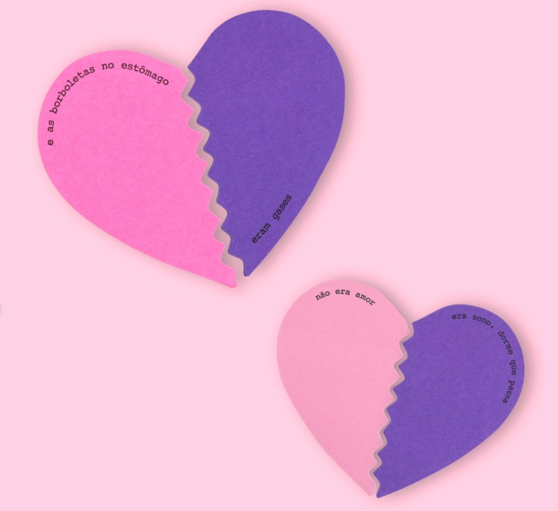 - Smart notes Sátira – Blocos adesivos em formato de coração dividido ao meio, com frases irônicas que se complementam, trazendo humor à organização do dia a dia.