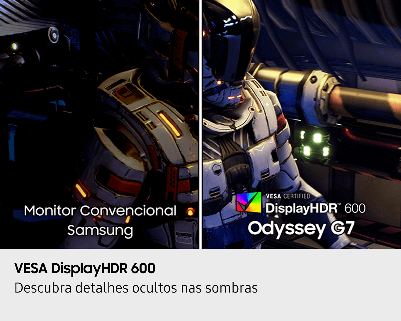 Graças à tecnologia DisplayHDR 600, o Odyssey G7 oferece contraste aprimorado, com pretos profundos e brancos brilhantes. Essa fidelidade visual revela nuances antes imperceptíveis, ampliando a imersão em jogos com iluminação complexa e conteúdos multimídia.