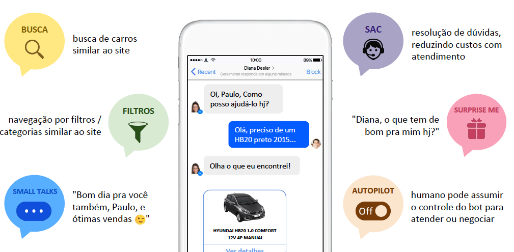 O robô da AutoAvaliar conta com sistema de inteligência artificial criado pela Smarters, empresa especializada em desenvolvimento de programas automatizados. As vendas serão feitas pelo avatar da Diana Deeler, já conhecida no mercado automotivo para transações entre concessionárias e lojistas multimarcas, e que agora acaba de se tornar o bot com sistema de inteligência artificial acoplado.