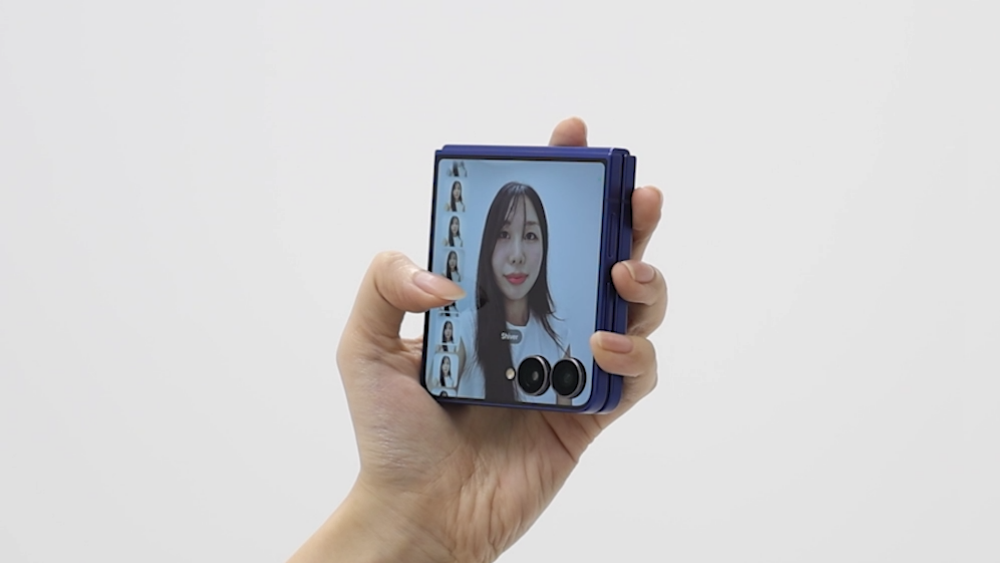 Além disso, é possível aplicar filtros em tempo real diretamente na Tela Externa, permitindo capturar a aparência desejada sem precisar de edição posterior. Com esse recurso, você pode tirar a selfie perfeita usando apenas a Tela Externa do seu Galaxy Z Flip7.