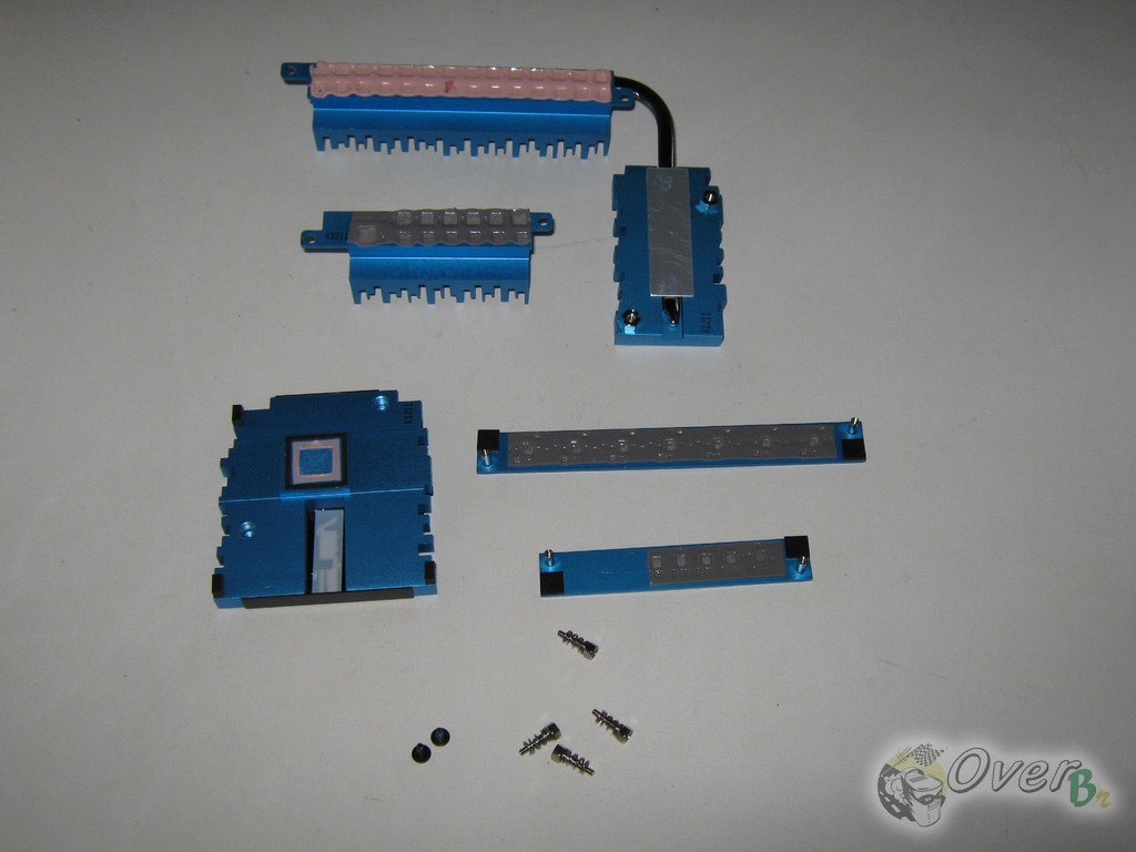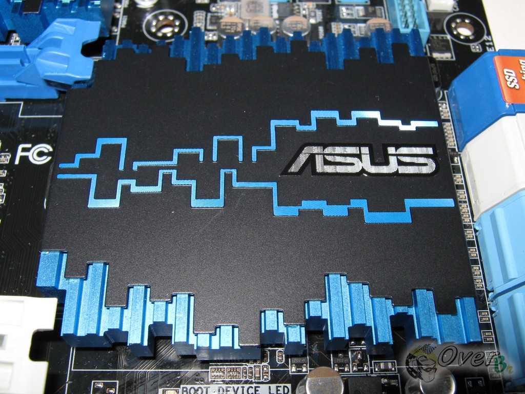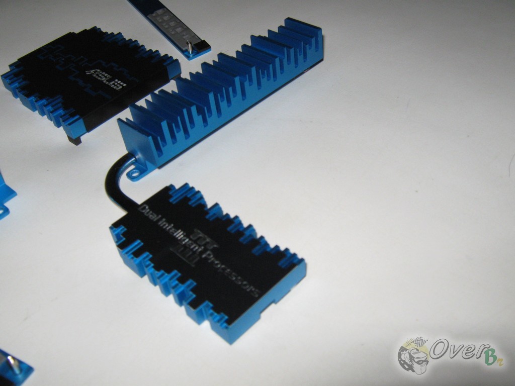 A peça responsável pela dissipação do calor gerado pelo Z77 é retangular, com destaque ao nome do fabricante “cravejado” nela e que devido a um led localizado na placa-mãe acaba por ficar aceso em azul… Sem dúvidas fica um visual interessante (principalmente com pouca iluminação) e que deve agradar os entusiastas do casemod. :)